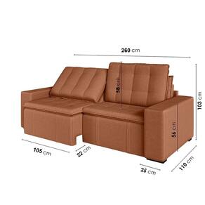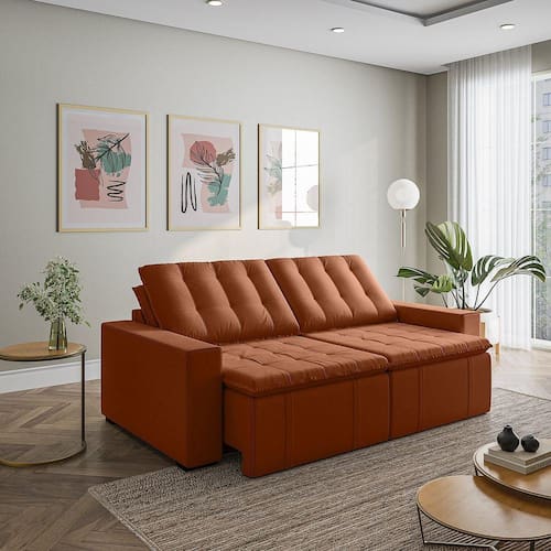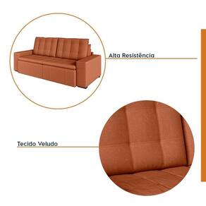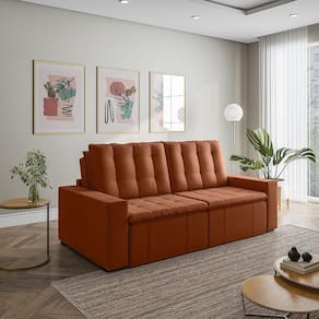 O Sofá Cama Palmeira MadeiraMadeira é a solução perfeita para quem tem pouco espaço disponível. Com ele você poderá acomodar suas visitas com conforto e praticidade. Produzido em madeira maciça de eucalipto, suporta até 400kg. Depois nos conte como foi a experiência de compra e como ficou seu ambiente nos comentários! Acompanha Almofadas extras: Não Almofada do assento: Fixa Almofada do encosto: Removível Altura do assento até o chão: 48 Altura do Encosto: 58 Altura dos Pés: 3 Ambiente Principal: Sala de Estar Complexidade da Montagem: Baixa: pode ser montado por uma pessoa sozinha Cor: Terracota Cor do Produto: Terracota Densidade do Assento: D-23 Densidade do Encosto: Camadas de Densidades Diferentes Enchimento do Assento: Espuma Enchimento do Encosto: Fibra Siliconada Estilo de Braço: Braços Quadrados Firmeza do Assento: Médio Informações Complementares: Densidade Braço D19. Enchimento do encosto: fibra siliconada com flocos de espuma envolvidas com manta siliconada. Itens Inclusos: 1 Sofá, Kit Ferragens e Manual de Montagem Linha ou Coleção: Palmeira Manual de Montagem e Instalação: https://product-hub-prd.madeiramadeira.com.br/879719/documents/98ecefa1-281e-43ad-8850-901e4677721bpalmeira240260280bracoreto.pdf Material dos Pés: Polimero Modelo: Retrátil e Reclinável Necessita Montagem: Sim Nível de Conforto: Macio Origem do Produto: Nacional Peso: 87 Pet Friendly: Não Possui Entrada USB: Não Possui Percintas Elásticas: Sim Possui Pés: 08 Possui Rodízio: Sim Profundidade Quando Estendido: 148 Recomendações de Uso, Manutenção e Limpeza: Evitar exposição direta à luz solar, limpar com escova macia e aspirar o pó semanalmente, não utilizar produtos químicos, removedores, alvejantes, etc. Evite exercer pressão excessiva sobre determinada partes do estofado, não utilizar para limpeza equipamentos a vapor de água. Resistente à Chuva: Não Revestimento do Braço: Veludo Rodízio com Trava: Não Sistema de Montagem: Parafusos e Engates Tecido Predominante: Veludo Tipo de Encosto: Regulável Tipo de Mola: Molas Bonnel