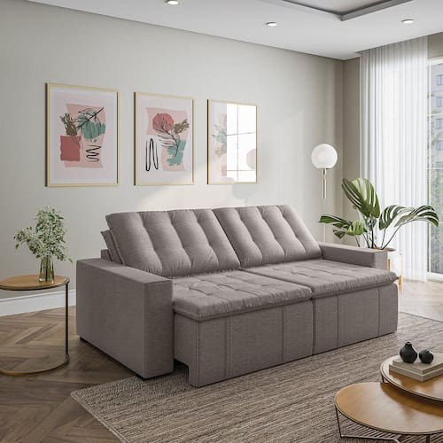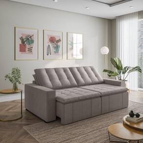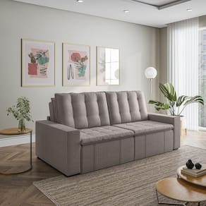 O Sofá Cama Palmeira MadeiraMadeira é a solução perfeita para quem tem pouco espaço disponível. Com ele você poderá acomodar suas visitas com conforto e praticidade. Produzido em madeira maciça de eucalipto, suporta até 400kg. Depois nos conte como foi a experiência de compra e como ficou seu ambiente nos comentários! Acompanha Almofadas extras: Não Almofada do assento: Fixa Almofada do encosto: Removível Altura do assento até o chão: 48 Altura do Encosto: 58 Altura dos Pés: 3 Ambiente Principal: Sala de Estar Complexidade da Montagem: Baixa: pode ser montado por uma pessoa sozinha Cor: Marrom Cor do Produto: Marrom Densidade do Assento: D-23 Densidade do Encosto: Camadas de Densidades Diferentes Enchimento do Assento: Espuma Enchimento do Encosto: Fibra Siliconada Estilo de Braço: Braços Quadrados Firmeza do Assento: Médio Informações Complementares: Densidade Braço D19. Enchimento do encosto: fibra siliconada com flocos de espuma envolvidas com manta siliconada. Itens Inclusos: Sofá, 8 pés e Manual de Montagem Linha ou Coleção: Palmeira Manual de Montagem e Instalação: https://product-hub-prd.madeiramadeira.com.br/877892/documents/03e302c3-cc94-4083-9b6e-e7123e9c3a84788ManualSofPalmeira240alt.pdf Material dos Pés: Polimero Necessita Montagem: Sim Nível de Conforto: Macio Origem do Produto: Nacional Peso: 92 Pet Friendly: Não Possui Entrada USB: Não Possui Percintas Elásticas: Sim Possui Pés: 08 Possui Rodízio: Sim Profundidade Quando Estendido: 148 Recomendações de Uso, Manutenção e Limpeza: Evitar exposição direta à luz solar, limpar com escova macia e aspirar o pó semanalmente, não utilizar produtos químicos, removedores, alvejantes, etc. Evite exercer pressão excessiva sobre determinada partes do estofado, não utilizar para limpeza equipamentos a vapor de água. Resistente à Chuva: Não Revestimento do Braço: Linho Rodízio com Trava: Não Sistema de Montagem: Parafusos e Engates Suporta Até (kg): 200 Tecido Predominante: Linho Tipo de Encosto: Regulável Tipo de Mola: Molas Bonnel Ean: 7909903474914