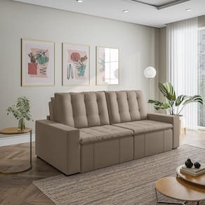 O Sofá Cama Palmeira MadeiraMadeira é a solução perfeita para quem tem pouco espaço disponível. Com ele você poderá acomodar suas visitas com conforto e praticidade. Produzido em madeira maciça de eucalipto, suporta até 400kg. Depois nos conte como foi a experiência de compra e como ficou seu ambiente nos comentários! Acompanha Almofadas extras: Não Almofada do assento: Fixa Almofada do encosto: Removível Altura do assento até o chão: 48 Altura do Encosto: 58 Altura dos Pés: 3 Ambiente Principal: Sala de Estar Complexidade da Montagem: Baixa: pode ser montado por uma pessoa sozinha Cor: Castor Cor do Produto: Castor Densidade do Assento: D-23 Densidade do Encosto: Camadas de Densidades Diferentes Enchimento do Assento: Espuma Enchimento do Encosto: Fibra Siliconada Estilo de Braço: Braços Quadrados Firmeza do Assento: Médio Informações Complementares: Densidade Braço D19. Enchimento do encosto: fibra siliconada com flocos de espuma envolvidas com manta siliconada. Itens Inclusos: Sofá, 8 pés e Manual de Montagem Linha ou Coleção: Palmeira Manual de Montagem e Instalação: https://product-hub-prd.madeiramadeira.com.br/877885/documents/549744a0-0190-4656-8717-9069c1298535781ManualSofPalmeira240alt.pdf Material dos Pés: Polimero Necessita Montagem: Sim Nível de Conforto: Macio Origem do Produto: Nacional Peso: 92 Pet Friendly: Não Possui Entrada USB: Não Possui Percintas Elásticas: Sim Possui Pés: 08 Possui Rodízio: Sim Profundidade Quando Estendido: 148 Recomendações de Uso, Manutenção e Limpeza: Evitar exposição direta à luz solar, limpar com escova macia e aspirar o pó semanalmente, não utilizar produtos químicos, removedores, alvejantes, etc. Evite exercer pressão excessiva sobre determinada partes do estofado, não utilizar para limpeza equipamentos a vapor de água. Resistente à Chuva: Não Revestimento do Braço: Veludo Rodízio com Trava: Não Sistema de Montagem: Parafusos e Engates Suporta Até (kg): 200 Tecido Predominante: Veludo Tipo de Encosto: Regulável Tipo de Mola: Molas Bonnel Ean: 7909903474846
