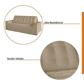 O Sofá Cama Palmeira MadeiraMadeira é a solução perfeita para quem tem pouco espaço disponível. Com ele você poderá acomodar suas visitas com conforto e praticidade. Produzido em madeira maciça de eucalipto, com as seguintes medidas (A x L x P): 103cm x 240cm x 112cm e suporta até 400kg. Depois nos conte como foi a experiência de compra e como ficou seu ambiente nos comentários! Produto Montado: Sim Altura do assento até o chão: 48.0000 Ambiente Principal: Sala de Estar codigo_ean: 7909903193051 Complexidade da Montagem: Baixa: pode ser montado por uma pessoa sozinha Cor: Bege Enchimento do Braço: Fibra Siliconada Enchimento do Encosto: Fibra Siliconada Estilo de Braço: Braços Pillow Top Informações Complementares: Densidade Braço D19. Enchimento do encosto: fibra siliconada com flocos de espuma envolvidas com manta siliconada. Manual de Montagem e Instalação: https://product-hub-prd.madeiramadeira.com.br/814311/documents/8661f231-71df-4d20-983c-237c56dec4692badb3ManualSofPalmeira240.pdf Material dos Pés: Plástico Modelo: Sofá Bipartido Necessita Montagem: Sim Origem do Produto: Nacional Pet Friendly: Não Possui Baú: Não Possui Rodízio: Sim Reclinável: Sim Recomendações de Uso, Manutenção e Limpeza: Evitar exposição direta à luz solar, limpar com escova macia e aspirar o pó semanalmente, não utilizar produtos químicos, removedores, alvejantes, etc. Evite exercer pressão excessiva sobre determinada partes do estofado, não utilizar para limpeza equipamentos a vapor de água. Revestimento do Assento: Veludo Revestimento do Braço: Veludo Revestimento do Encosto: Veludo Sistema de Montagem: Parafusos e Engates Tipo de Mola: Molas Bonnel