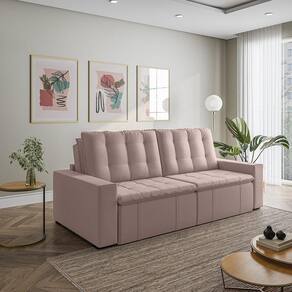 O Sofá Cama Palmeira MadeiraMadeira é a solução perfeita para quem tem pouco espaço disponível. Com ele você poderá acomodar suas visitas com conforto e praticidade. Produzido em madeira maciça de eucalipto, suporta até 400kg. Depois nos conte como foi a experiência de compra e como ficou seu ambiente nos comentários! Acompanha Almofadas extras: Não Almofada do assento: Fixa Almofada do encosto: Removível Altura do assento até o chão: 48 Altura do Encosto: 58 Altura dos Pés: 3 Ambiente Principal: Sala de Estar Complexidade da Montagem: Baixa: pode ser montado por uma pessoa sozinha Cor: Rosa Cor do Produto: Rosa Densidade do Assento: D-23 Densidade do Encosto: Camadas de Densidades Diferentes Enchimento do Assento: Espuma Enchimento do Encosto: Fibra Siliconada Estilo de Braço: Braços Quadrados Firmeza do Assento: Médio Informações Complementares: Densidade Braço D19. Enchimento do encosto: fibra siliconada com flocos de espuma envolvidas com manta siliconada. Itens Inclusos: 1 Sofá, Kit Ferragens e Manual de Montagem Linha ou Coleção: Palmeira Manual de Montagem e Instalação: https://product-hub-prd.madeiramadeira.com.br/879729/documents/dcddef66-b665-43bb-af81-37c513bce127palmeira240260280bracoreto.pdf Material dos Pés: Polimero Modelo: Retrátil e Reclinável Necessita Montagem: Sim Nível de Conforto: Macio Origem do Produto: Nacional Peso: 93 Pet Friendly: Não Possui Entrada USB: Não Possui Percintas Elásticas: Sim Possui Pés: 08 Possui Rodízio: Sim Profundidade Quando Estendido: 148 Recomendações de Uso, Manutenção e Limpeza: Evitar exposição direta à luz solar, limpar com escova macia e aspirar o pó semanalmente, não utilizar produtos químicos, removedores, alvejantes, etc. Evite exercer pressão excessiva sobre determinada partes do estofado, não utilizar para limpeza equipamentos a vapor de água. Resistente à Chuva: Não Revestimento do Braço: Veludo Rodízio com Trava: Não Sistema de Montagem: Parafusos e Engates Tecido Predominante: Veludo Tipo de Encosto: Regulável Tipo de Mola: Molas Bonnel