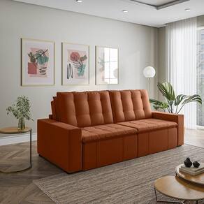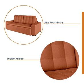 O Sofá Cama Palmeira MadeiraMadeira é a solução perfeita para quem tem pouco espaço disponível. Com ele você poderá acomodar suas visitas com conforto e praticidade. Produzido em madeira maciça de eucalipto, suporta até 400kg. Depois nos conte como foi a experiência de compra e como ficou seu ambiente nos comentários! Acompanha Almofadas extras: Não Almofada do assento: Fixa Almofada do encosto: Removível Altura do assento até o chão: 48 Altura do Encosto: 58 Altura dos Pés: 3 Ambiente Principal: Sala de Estar Complexidade da Montagem: Baixa: pode ser montado por uma pessoa sozinha Cor: Terracota Cor do Produto: Terracota Densidade do Assento: D-23 Densidade do Encosto: Camadas de Densidades Diferentes Enchimento do Assento: Espuma Enchimento do Encosto: Fibra Siliconada Estilo de Braço: Braços Quadrados Firmeza do Assento: Médio Informações Complementares: Densidade Braço D19. Enchimento do encosto: fibra siliconada com flocos de espuma envolvidas com manta siliconada. Itens Inclusos: 1 Sofá, Kit Ferragens e Manual de Montagem Linha ou Coleção: Palmeira Manual de Montagem e Instalação: https://product-hub-prd.madeiramadeira.com.br/879730/documents/58ac82a3-6be5-442f-8d38-000532f23720palmeira240260280bracoreto.pdf Material dos Pés: Polimero Modelo: Retrátil e Reclinável Necessita Montagem: Sim Nível de Conforto: Macio Origem do Produto: Nacional Peso: 93 Pet Friendly: Não Possui Entrada USB: Não Possui Percintas Elásticas: Sim Possui Pés: 08 Possui Rodízio: Sim Profundidade Quando Estendido: 148 Recomendações de Uso, Manutenção e Limpeza: Evitar exposição direta à luz solar, limpar com escova macia e aspirar o pó semanalmente, não utilizar produtos químicos, removedores, alvejantes, etc. Evite exercer pressão excessiva sobre determinada partes do estofado, não utilizar para limpeza equipamentos a vapor de água. Resistente à Chuva: Não Revestimento do Braço: Veludo Rodízio com Trava: Não Sistema de Montagem: Parafusos e Engates Tecido Predominante: Veludo Tipo de Encosto: Regulável Tipo de Mola: Molas Bonnel