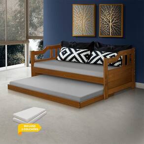 Esse belíssimo Sofá Cama possui um design minimalista e atrativo o que permite que o mesmo seja alocado em ambientes variados como salas de estar ou quartos e ele também uma estrutura em madeira de reflorestada, altamente resistente e durável. Ideal para acomodar Colchão Solteiro (088).CaracterísticasDimensões do Sofá Cama:Aberto: Comprimento 195cm - Profundidade 190cm - Altura 80cmFechado: Comprimento 195cm - Profundidade 96cm - Altura 80cmCor: CastanhoItens Inclusos:1 Sofá cama2 ColchõesColchão indicado: Comprimento 188cm - Profundidade 88cm - Altura 12cmDescrição TécnicaMadeira maciçaEstrutura do material:Barras com 25mm e braços laterais com 20mmEspessura da cama auxiliar 22mmAcabamento em Verniz PU Semi BrilhoPeso suportado por pessoa:Sofá Cama 200kgCama auxiliar 120kg4 Pés em madeiraEspessura dos pés 90mmx25mmRipas em Compensado Naval 70mm x 10mmSarrafos em Eucalipto com espessura de 22mm x 45mmComplexidade da montagem: Média, pode ser montado por apenas uma pessoa e/ou necessite de maior conhecimento para montagem.Recomendações de uso, manutenção e limpeza: Limpar com flanela ou pano macio seco, não utilizar produtos abrasivos, desengordurantes, álcool ou solvente. Não expor o produto diretamente a luz solar e à umidade.ATENÇÃOAS IMAGENS SÃO MERAMENTE ILUSTRATIVAS E PODEM SOFRER VARIAÇÕES DE COR E PEQUENOS DETALHES DE ACORDO COM O SEU MONITOR, ILUMINAÇÃO DO AMBIENTE E ATÉ MESMO A SUA PERCEPÇÃO VISUAL.Sofà Cama Solteiro Madeira MaciÃa com Cama Auxiliar e 2 ColchÃes Texas - Castanho
