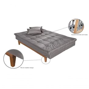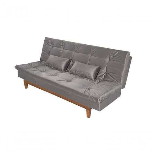 Este sofá cama acomoda tranquilamente 3 pessoas sentadas e duas deitadas, ele pode ser até 5 posições diferentes. Espuma de alto conforto com a densidade tanto no assento como no encosto D26, com percintas elásticas e molas bonel, pés e base em madeira maciça e acompanha duas almofadas que pode ser como travesseiro.