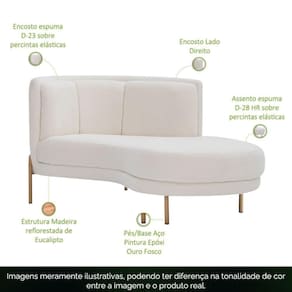 Estrutura em madeira reflorestada de eucalipto, MDF e OSB. Base em aço.Descrição do ProdutoA Chaise Penélope é sinônimo de elegância e bem-estar. Seu design único com linhas suaves e toque contemporâneo valoriza qualquer espaço desde salas até quartos e ambientes de leitura. A estrutura em madeira reflorestada de eucalipto e base em aço com pintura epóxi oferece durabilidade, enquanto o assento e encosto com espumas D-28 e D-23 garantem conforto excepcional. Revestida em bouclê, essa peça é perfeita para quem busca estilo e aconchego no dia a dia. Ideal para compor decorações clássicas, modernas ou sofisticadas!