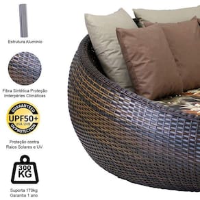 Caracteristicas: Pecas produzidas em aluminio e revestidas em fibra sintetica com protecao UV. Nossos produtos sao artesanais e podem ocorrer variacoes na medida de ate 2cm. As cores dos produtos podem variar de acordo com o ambiente e com a iluminacao em que as fotos foram tiradas. Estofado em couro nautico da Kelsons ou tecido acquablock da Karsten. Utilizamos a espuma D28 para o assento. OBS Almofadas Tecido: O Acquablock Karsten e um tecido inteligente com diferenciais tecnologicos, confeccionado em 72 algodao 28 poliester e 205g/metros quadrados.