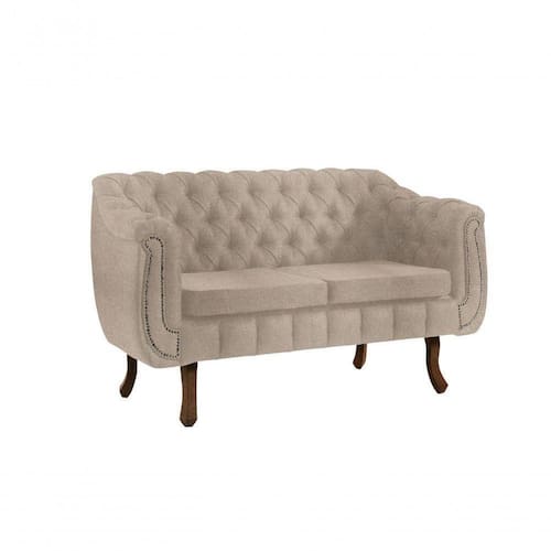 Sofá Chesterfield 2 lugares fabricado em madeira de eucalipto, revestido com espuma D28 e tecido, com detalhes em capitonê e tachas. Pés estilo Luis XV em madeira tauari.
