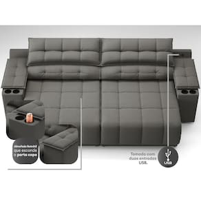 USB:Sofá com uma tomada contendo duas entradas USB para carregamento de eletrônicos, potência de 5V.Não incluso fonte de energia. Extensão do cabo da tomada pode variar de 70cm a 90cm.