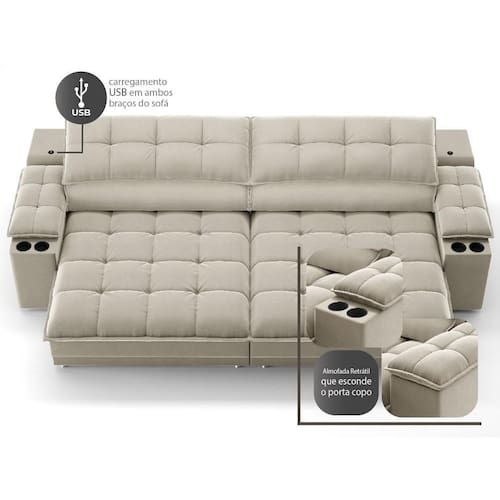 USB:Sofá com uma tomada contendo duas entradas USB para carregamento de eletrônicos, potência de 5V.Não incluso fonte de energia. Extensão do cabo da tomada pode variar de 70cm a 90cm.