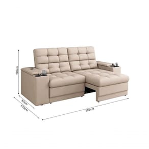 Assento: Fibra Siliconada e flocosEncosto: Removível com fibra e flocosBraço: Espuma D18 com porta coposCorrediça: TubularPés: Sapata PVCEstrutura: Madeira (Eucalipto/OSB)Percintas: Elásticas ASS/ENCDimensões: Comprimento: 205 cm, Altura: 100 cm, Profundidade: 92 cm, Abertura: 125 cmPillow top: NãoCubagem: 1,45 M3Peso Aproximado: 50kg