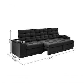 Assento: Espuma D28Encosto: Removível com fibra e flocosBraço: Espuma D18 com porta coposCorrediça: TubularPés: Sapata PVCEstrutura: Madeira (Eucalipto/OSB)Percintas: Elásticas ASS/ENCDimensões: Comprimento: 230 cm, Altura: 100 cm, Profundidade: 92 cm, Abertura: 125 cmPillow top: NãoCubagem: 1,45 M3Peso Aproximado: 55kg