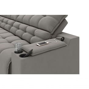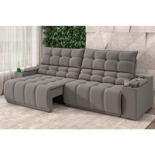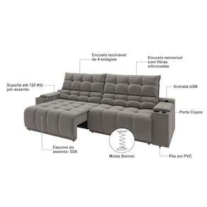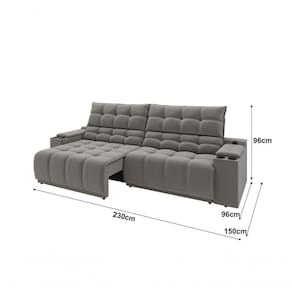 Assento: Espuma D28 para máximo conforto.Encosto: Removível com fibra siliconada.Braço: Espuma D18 com porta copos integrados.Corrediça: Tubular.Pés: PVC.Estrutura: Madeira (Eucalipto/OSB) para durabilidade.Comnto: 230cm.Altura: 96 cm.Profundidade: 96 cm (abertura de 150 cm).Pillow top: Não.Peso aproximado: 60kg.
