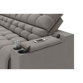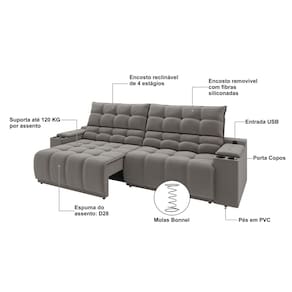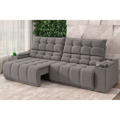 DIFERENCIAIS DO PRODUTO • Sofá retrátil e reclinável com abertura de até 1,50m • 4 posições de reclinação para máximo conforto • Tecido Suede Cinza fácil de combinar com qualquer decoração • 2 porta-copos integrados nos braços • Entrada USB embutida para carregar celulares e outros dispositivos • Estrutura em madeira de eucalipto e OSB, garantindo durabilidade • Espuma D28 no assento para firmeza e maciez