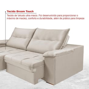 Sofá retrátil e reclinável com super Pillow Top, espuma D26, molas bonel e percintas italianas. Sofisticação com um design pensado para a vida contemporânea, mesclando a praticidade e o conforto para seu o dia a dia. Um estofado totalmente retrátil e reclinável, seu encosto tem o enchimento com fibra 100% siliconada, revestido no tecido veludo com toque macio e aveludado.