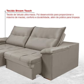 Sofá retrátil e reclinável com super Pillow Top, espuma D26, molas bonel e percintas italianas. Sofisticação com um design pensado para a vida contemporânea, mesclando a praticidade e o conforto para seu o dia a dia. Um estofado totalmente retrátil e reclinável, seu encosto tem o enchimento com fibra 100% siliconada, revestido no tecido veludo com toque macio e aveludado.