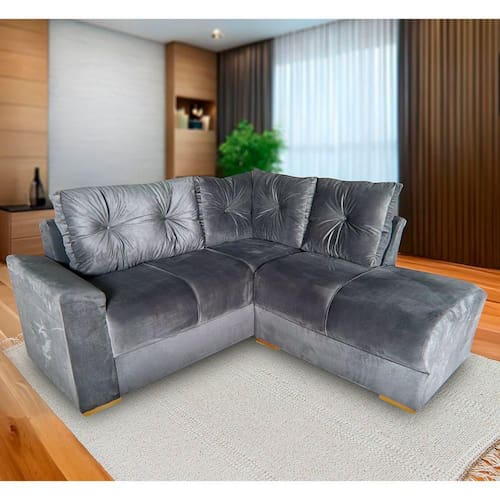 O tecido em veludo grafite confere um toque de sofisticação e modernidade, enquanto sua cor neutra combina perfeitamente com diversas paletas de decoração, facilitando a integração em qualquer ambiente.