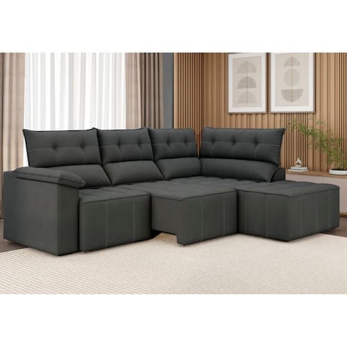 Design funcional para ambientes modernos Composto por módulos de 2 lugares e canto, possui sapatas em PVC que facilitam a estabilidade e permitem o uso de retrátil quando disponível. O encosto removível e os braços com enchimento de fibra e flocos completam o visual elegante.