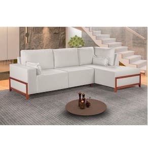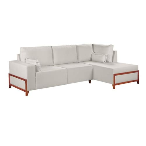 O modelo inclui chaise integrada e almofadas decorativas, que completam o visual com charme e conforto. Os pes em madeira macica tauari adicionam um toque natural e sofisticado, harmonizando facilmente com diferentes estilos de decoracao.