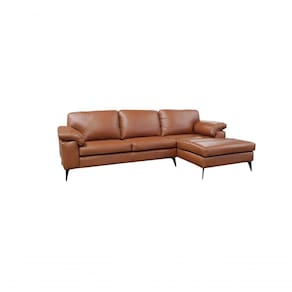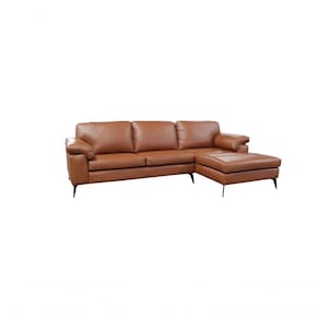 Sofá de Couro Asti 3 Lugares com Chaise Direita - Conhaque com BrilhoPara os que querem sair do tradicional o sofá de couro com CHAISE é perfeito para modernizar sua sala de estar ou TV, e o sofá de couro Asti é ideal para proporcionar conforto e tranquilidade para relaxar, totalmente revestido em couro natural deixando o ambiente ainda mais elegante, o couro oferece qualidade, funcionalidade e durabilidade ao produto. O conforto é garantido por ter encosto fixo com preenchimento de fibra de silicone em formato de colmeia (vários compartimentos que proporcionam um encosto uniforme) e assentos fixos em espumas D-30 soft revestidas com manta de silicone, as percintas elásticas são essenciais e proporcionam maior conforto, suportando o peso e garantindo assim a durabilidade do produto, os braços também são fixos e possuem enchimento de fibra de silicone em formato de colmeia, sua estrutura de madeira de reflorestamento (eucalipto) assegura resistência e estabilidade, e para dar o detalhe final no design seus pés são metálicos com pintura eletrostática.