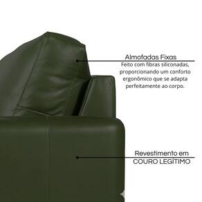 Imagens ilustrativas, cores podem variar. Uso interno. Verifique embalagem no recebimento. Montagem por conta do cliente. Não realizamos subida. Garantia: 90 dias. Acompanha Almofadas extras: Não Almofada do assento: Fixa Almofada do encosto: Fixa Altura do assento até o chão: 45 cm Altura do Braço: 60 cm Altura do Encosto: 45 cm Altura dos Pés: 15 cm Ambiente Principal: Sala de Estar codigo_ean: 7900288244673 Cor: Musgo Cor do Produto: MUSGO Densidade do Assento: D-26 Densidade do Encosto: D-26 Enchimento do Assento: Espuma Enchimento do Encosto: Fibra Siliconada Estilo de Braço: Braços Redondos Firmeza do Assento: Médio Informações Complementares: Evitar exposição direta à luz solar, limpar com escova com pano úmido semanalmente, não utilizar produtos químicos, removedores, alvejantes, etc. Evite exercer pressão excessiva sobre determinada partes do estofado, não utilizar para limpeza equipamentos Itens Inclusos: 01 SOFÁ Largura do Braço: 10 cm Marca: LEME MOVELARIA Material dos Pés: FERRO Necessita Montagem: Não Nível de Conforto: Intermediário Origem do Produto: Nacional Peso: 35 kg Peso Suportado por m²: 130 kg/m² Pet Friendly: Sim Possui Mola: Sim Possui Percintas Elásticas: Sim Possui Pés: 04 Possui Rodízio: Não Quantidade de Itens: 1 Recomendações de Uso, Manutenção e Limpeza: Pano limpo e levemente úmido Revestimento do Braço: ESPUMA D 18 E PLUMANTE Suporta Até (kg): 160 kg Tecido Predominante: Couro Tipo de Encosto: Fixo Tipo de Mola: Molas Bonnel Tipo de Sofá: Sofá Comum