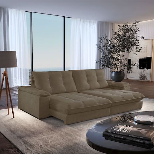 Características: Marca: Meu Sofá Online Modelo: Dublin Tecido: Veludo Espuma: D28 Assento Retrátil: Sim Assento: Percinta elástica, molas ensacadas e Metalessê Pilow: 25 cm Encosto Reclinável: Sim, com Catraca Blindada 90 Almofadas do Encosto: Fibra de poliéster siliconada Braços: Almofadas com Fibras de Poliéster Siliconada