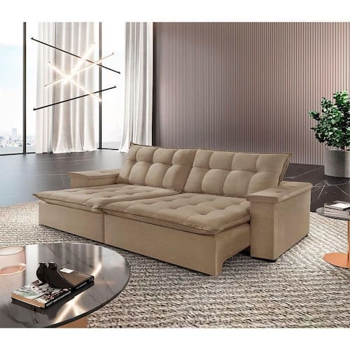 Assento: Retratil com Percinta elastica, molas espirais, espuma D-28 soffet com metalasse, pillow top de 10 cm.