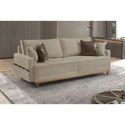 O encosto com almofadas soltas em fibra siliconada proporciona apoio ergonomico e aconchegante, enquanto os pes em madeira macica completam o visual sofisticado.