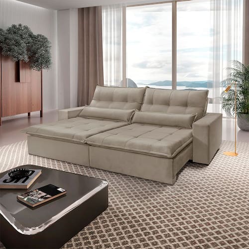 Assento: Retrátil com percinta elástica, molas espirais, espuma D-28, pillow de 15 cm, molas ensacadas e matelasse.