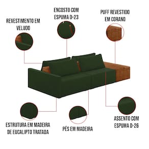 O Sofá Ilha 2 Lugares Living Lary de 232 cm é uma peça de destaque para qualquer ambiente, com um design moderno este sofá apresenta uma estrutura modular permitindo reorganizá-la criando um layout personalizado. Revestido no luxuoso tecido Veludo em um tom envolvente de Verde, proporcionando uma sensação de aconchego e sofisticação. Seu assento é fixo em espuma D-26 com multimolas de sustentação espiral e ensacadas, solda dupla, manta acrílica e percintas elásticas, suportando até 150 kg por assento. Já o encosto possui espuma D-23 sendo ele removível, com almofadas soltas preenchidas com 100% de fibra siliconada, proporcionando um apoio macio para as costas. Os pés são feitos em madeira certificando maior estabilidade ao móvel. Este sofá apresenta características de alta qualidade, incluindo uma estrutura de madeira tratada de eucalipto reflorestada, garantindo maior resistência e durabilidade ao produto, além de contribuir para a sustentabilidade ambiental. Com cinco assentos no total, um deles revestido em tecido Sintético Pu Nozes com detalhes em gomos feito com a técnica de costura pespontos, este sofá oferece espaço suficiente para acomodar confortavelmente até seis pessoas, tornando-o ideal para receber amigos e familiares com estilo e conforto. Pode ser utilizado em escritórios, restaurantes e demais ambientes corporativos.O Sofá Lary é a escolha perfeita para quem busca uma peça de mobiliário que une funcionalidade, conforto e estilo em uma única solução para o seu ambiente. Aproveite!