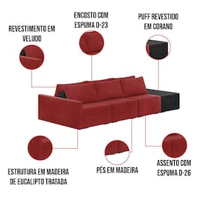 O Sofá Ilha 3 Lugares Living Lary de 372 cm é uma peça de destaque para qualquer ambiente, com um design moderno este sofá apresenta uma estrutura modular permitindo reorganizá-la criando um layout personalizado. Revestido no luxuoso tecido Veludo em um tom envolvente de Vermelho, proporcionando uma sensação de aconchego e sofisticação. Seu assento é fixo em espuma D-26 com multimolas de sustentação espiral e ensacadas, solda dupla, manta acrílica e percintas elásticas, suportando até 150 kg por assento. Já o encosto possui espuma D-23 sendo ele removível, com almofadas soltas preenchidas com 100% de fibra siliconada, proporcionando um apoio macio para as costas. Os pés são feitos em madeira certificando maior estabilidade ao móvel. Este sofá apresenta características de alta qualidade, incluindo uma estrutura de madeira tratada de eucalipto reflorestada, garantindo maior resistência e durabilidade ao produto, além de contribuir para a sustentabilidade ambiental. Com sete assentos no total, um deles revestido em tecido Sintético Pu Preto com detalhes em gomos feito com a técnica de costura pespontos, este sofá oferece espaço suficiente para acomodar confortavelmente até oito pessoas, tornando-o ideal para receber amigos e familiares com estilo e conforto. Pode ser utilizado em escritórios, restaurantes e demais ambientes corporativos.O Sofá Lary é a escolha perfeita para quem busca uma peça de mobiliário que une funcionalidade, conforto e estilo em uma única solução para o seu ambiente. Aproveite!