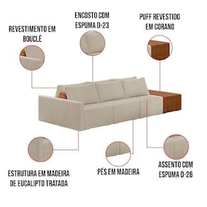 O Sofá Ilha 3 Lugares Living Lary de 402 cm é uma peça de destaque para qualquer ambiente, com um design moderno este sofá apresenta uma estrutura modular permitindo reorganizá-la criando um layout personalizado. Revestido no luxuoso tecido Bouclê em um tom envolvente de Bege, proporcionando uma sensação de aconchego e sofisticação. Seu assento é fixo em espuma D-26 com multimolas de sustentação espiral e ensacadas, solda dupla, manta acrílica e percintas elásticas, suportando até 150 kg por assento. Já o encosto possui espuma D-23 sendo ele removível, com almofadas soltas preenchidas com 100% de fibra siliconada, proporcionando um apoio macio para as costas. Os pés são feitos em madeira certificando maior estabilidade ao móvel. Este sofá apresenta características de alta qualidade, incluindo uma estrutura de madeira tratada de eucalipto reflorestada, garantindo maior resistência e durabilidade ao produto, além de contribuir para a sustentabilidade ambiental. Com sete assentos no total, um deles revestido em tecido Sintético Pu Nozes com detalhes em gomos feito com a técnica de costura pespontos, este sofá oferece espaço suficiente para acomodar confortavelmente até oito pessoas, tornando-o ideal para receber amigos e familiares com estilo e conforto. Pode ser utilizado em escritórios, restaurantes e demais ambientes corporativos.O Sofá Lary é a escolha perfeita para quem busca uma peça de mobiliário que une funcionalidade, conforto e estilo em uma única solução para o seu ambiente. Aproveite! Dimensões do Produto: Altura Total: 82 cm Largura Total: 402 cm Profundidade Total: 160 cm Peso: 171 kg Largura do Braço: 12 cm Largura do Assento: 110 cm Profundidade do Assento: Variável. Altera de acordo com a posição do encosto Outras Medidas: 1x Módulo Lateral com Braço: 122 x 82 x 160 cm 2x Módulo Central: 110 x 82 x 160 cm Largura do Puff: 60 x 45 x 160 cm Altura do chão ao Assento: 45 cm Altura do Encosto: 37 cm Especificações do Produto: Estrutura: Madeira de Reflorestamento Tratada (Eucalipto) Espuma do Encosto: D-23, ajustável Espuma do Assento: D-26 Molas Ensacadas e Espirais com Percintas/Manta Acrílica Revestimento: Bouclê Possui Pés: Sim Tipo de Pés: Madeira Detalhes/Aplicações: Acompanha Almofadas Soltas 100% Fibras Siliconadas - Manta Acrílica Peso Suportado: Até 150 Kg por assento Quantidade de Assentos: 7 Assentos Quantidade de Lugares: Até 8 Lugares Tipo de Encosto: Móvel Tipo de Assento: Fixo É retrátil: Não É reclinável: Não Complexidade da Montagem: Baixo Diferenciais: Sofá modular, estilo ilha, pode ser aproveitado assentos em ambos os lados. Acompanha almofadas. Ideal para sala de estar, living e ambientes integrados Montagem: O produto é enviado montado, sendo necessário apenas a junção dos módulos. Garantia: 90 dias contra defeito de fabricação Instruções de Limpeza: Utilizar um pano limpo e levemente úmido Você irá Receber: 01 Sofá Entregue em: 04 Volumes