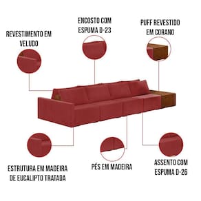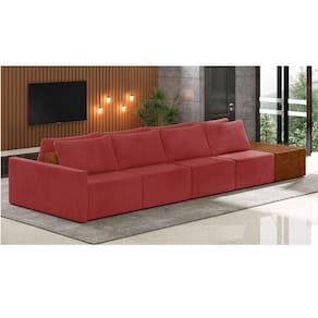 O Sofá Ilha 4 Lugares Living Lary de 392 cm é uma peça de destaque para qualquer ambiente, com um design moderno este sofá apresenta uma estrutura modular permitindo reorganizá-la criando um layout personalizado. Revestido no luxuoso tecido Veludo em um tom envolvente de Vermelho, proporcionando uma sensação de aconchego e sofisticação. Seu assento é fixo em espuma D-26 com multimolas de sustentação espiral e ensacadas, solda dupla, manta acrílica e percintas elásticas, suportando até 150 kg por assento. Já o encosto possui espuma D-23 sendo ele removível, com almofadas soltas preenchidas com 100% de fibra siliconada, proporcionando um apoio macio para as costas. Os pés são feitos em madeira certificando maior estabilidade ao móvel. Este sofá apresenta características de alta qualidade, incluindo uma estrutura de madeira tratada de eucalipto reflorestada, garantindo maior resistência e durabilidade ao produto, além de contribuir para a sustentabilidade ambiental. Com nove assentos no total, um deles revestido em tecido Sintético Pu Nozes com detalhes em gomos feito com a técnica de costura pespontos, este sofá oferece espaço suficiente para acomodar confortavelmente até dez pessoas, tornando-o ideal para receber amigos e familiares com estilo e conforto. Pode ser utilizado em escritórios, restaurantes e demais ambientes corporativos.O Sofá Lary é a escolha perfeita para quem busca uma peça de mobiliário que une funcionalidade, conforto e estilo em uma única solução para o seu ambiente. Aproveite!