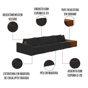 O Sofá Ilha 4 Lugares Living Lary de 512 cm é uma peça de destaque para qualquer ambiente, com um design moderno este sofá apresenta uma estrutura modular permitindo reorganizá-la criando um layout personalizado. Revestido no luxuoso tecido Veludo em um tom envolvente de Preto, proporcionando uma sensação de aconchego e sofisticação. Seu assento é fixo em espuma D-26 com multimolas de sustentação espiral e ensacadas, solda dupla, manta acrílica e percintas elásticas, suportando até 150 kg por assento. Já o encosto possui espuma D-23 sendo ele removível, com almofadas soltas preenchidas com 100% de fibra siliconada, proporcionando um apoio macio para as costas. Os pés são feitos em madeira certificando maior estabilidade ao móvel. Este sofá apresenta características de alta qualidade, incluindo uma estrutura de madeira tratada de eucalipto reflorestada, garantindo maior resistência e durabilidade ao produto, além de contribuir para a sustentabilidade ambiental. Com nove assentos no total, um deles revestido em tecido Sintético Pu Nozes com detalhes em gomos feito com a técnica de costura pespontos, este sofá oferece espaço suficiente para acomodar confortavelmente até dez pessoas, tornando-o ideal para receber amigos e familiares com estilo e conforto. Pode ser utilizado em escritórios, restaurantes e demais ambientes corporativos.O Sofá Lary é a escolha perfeita para quem busca uma peça de mobiliário que une funcionalidade, conforto e estilo em uma única solução para o seu ambiente. Aproveite!