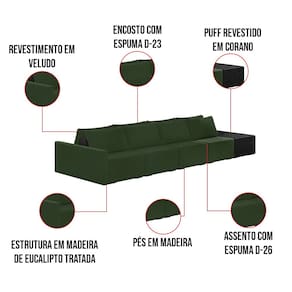 O Sofá Ilha 4 Lugares Living Lary de 512 cm é uma peça de destaque para qualquer ambiente, com um design moderno este sofá apresenta uma estrutura modular permitindo reorganizá-la criando um layout personalizado. Revestido no luxuoso tecido Veludo em um tom envolvente de Verde, proporcionando uma sensação de aconchego e sofisticação. Seu assento é fixo em espuma D-26 com multimolas de sustentação espiral e ensacadas, solda dupla, manta acrílica e percintas elásticas, suportando até 150 kg por assento. Já o encosto possui espuma D-23 sendo ele removível, com almofadas soltas preenchidas com 100% de fibra siliconada, proporcionando um apoio macio para as costas. Os pés são feitos em madeira certificando maior estabilidade ao móvel. Este sofá apresenta características de alta qualidade, incluindo uma estrutura de madeira tratada de eucalipto reflorestada, garantindo maior resistência e durabilidade ao produto, além de contribuir para a sustentabilidade ambiental. Com nove assentos no total, um deles revestido em tecido Sintético Pu Preto com detalhes em gomos feito com a técnica de costura pespontos, este sofá oferece espaço suficiente para acomodar confortavelmente até dez pessoas, tornando-o ideal para receber amigos e familiares com estilo e conforto. Pode ser utilizado em escritórios, restaurantes e demais ambientes corporativos.O Sofá Lary é a escolha perfeita para quem busca uma peça de mobiliário que une funcionalidade, conforto e estilo em uma única solução para o seu ambiente. Aproveite!