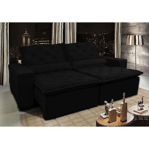 Sofá Lisboa 2,52m Retrátil, Reclinável Com Molas No Assento Tecido Suede Velusoft Preto - Cama Inbox Chegou o Maravilhoso Sofá Lisboa. O que o torna especial são assentos com espuma D33 envolvidas em fibra Siliconada Compactada para que tenha um toque gostoso e aconchegante, além de seu maravilhoso designer com costuras duplas e puxes que o embelezam, proporcionando conforto de um colchão em um Belíssimo Sofá. Sua sala jamais será como antes! Características: -Encosto Reclinável com 5 posições, almofadas fixas compostas de 80% fibra siliconada e 20% flocos de espuma e percintas elasticas para maior conforto. -Assentos: Retráteis com espuma D33 envolvidas em fibra SILICONADA compactada, Molas espiral, percintas Pneumáticas com feltro para proteger do atrito com as molas. -Braços: Com 25cm de largura e com espuma D23 e costuras duplas. -Fixação: Grampos galvanizados -Estrutura de Madeira maciça 100% eucalipto de reflorestamento, produto ecologicamente correto -Tecido suede com toque aveludado