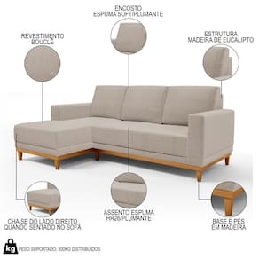 Esse sofá 3 lugares além de ser peça fundamental para sala de estar, ainda pode ser aproveitado como um ícone decorativo no ambiente. E tudo isso com a de conforto e de uma experiência acolhedora, uma vez que é fabricado com materiais de qualidade. Já os pés em madeira de eucalipto sólida garantem estabilidade e durabilidade, enquanto o revestimento em Boucle é suave ao toque e fácil de limpar. Para completar, a chaise é um charme à parte, pois além de oferecer descanso adicional para as pernas, ainda cria um ambiente contemporâneo.