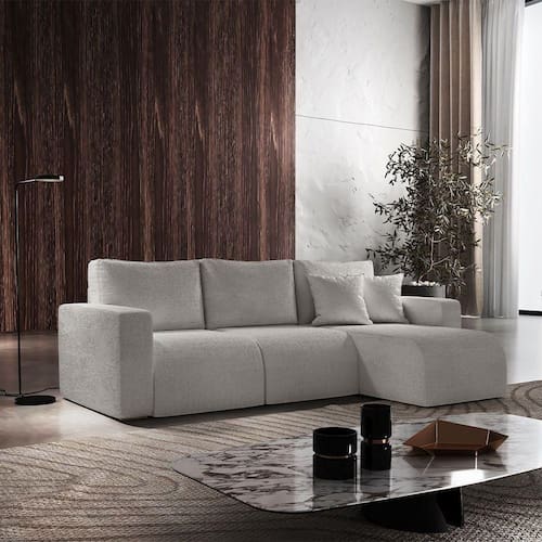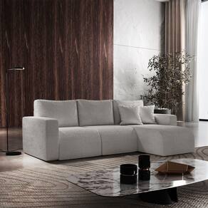 O Sofa Living conta com 01 modulo de 90cm com braco de 15cm, 01 modulo central de 90cm sem bracos e 01 chaise do lado direito de 90cm com braco de 15cm, totalizando uma largura de 300cm.