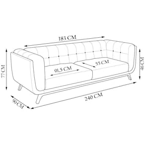Outras Medidas Largura livre do assento: 183 cm. Profundidade livre do assento: 55 cm. Altura do encosto: 40 cm. Largura do braço: 28 cm. Altura do assento ao chão: 46 cm.