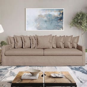 O Sofá Laguna não é apenas lindo e confortável; ele também é produzido com matérias-primas de alta qualidade. Sua estrutura é feita de madeira de eucalipto de reflorestamento com 25 mm de espessura, refletindo nosso compromisso com a sustentabilidade. O assento é estruturado com percintas elásticas, molas espirais de aço e almofadas soltas de espuma contínua D28 Supersoft, todas revestidas com capas de linho com zíper. O encosto possui almofadas soltas preenchidas com fibras de silicone, também revestidas com capas de linho removíveis.