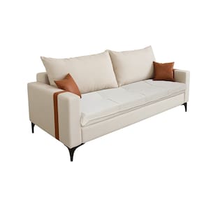 Características Tipo: Sofá Modelo: Madri Cor das faixas braços: Caramelo Cor do estofado: Bege Tecido dos braços: Faixa decorativa em tecido corino Revestimento do assento e encosto: Tecido Linho Estrutura resistente e estável Design contemporâneo e acolhedor Indicado para uso em ambientes internos