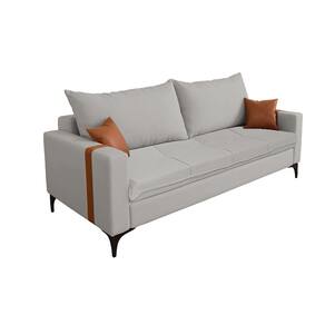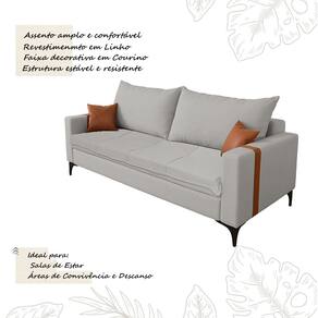Características Tipo: Sofá Modelo: Madri Cor das faixas braços: Caramelo Cor do estofado: Cinza Tecido dos braços: Faixa decorativa em tecido corino Revestimento do assento e encosto: Tecido Linho Estrutura resistente e estável Design contemporâneo e acolhedor Indicado para uso em ambientes internos