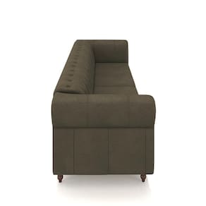 O revestimento em couro confere um aspecto luxuoso e elegante, refletindo o estilo clássico Chesterfield. Seus pés torneados fixos, em madeira maciça, adicionam um charme adicional e garantem estabilidade.