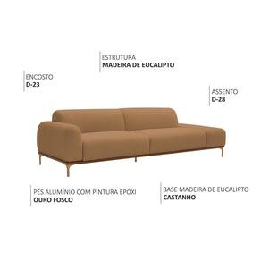 Características do Produto:Material da Estrutura: Madeira reflorestada de eucalipto, com partes em MDF e OSBMaterial do Assento: Espuma D-26 HR sobre percintas elásticasMaterial do Encosto: Espuma D-23 sobre percintas elásticasBraço: Espuma D-23Material da Base: Madeira de eucalipto envernizadaMaterial dos Pés: Alumínio com pintura epóxiTipo de Pés: FixoCor dos Pés: Ouro FoscoCor da Base: CastanhoQuantidade de Pés: 05Revestimento: BoucléPeso Suportado: Até 100 kg por assento