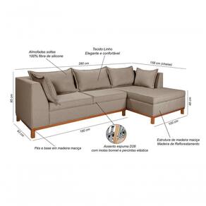Cor: Linho | Altura: 95 | Peso do Produto: 70 | Garantia do Fabricante: 3 | Tonalidade: Bege | Cômodo Indicado: Salas | Produto: Sofá | Tipo de Tecido: Linho | Quantidade de Lugares: 3 | Complexidade de Montagem: Baixa: pode ser montado por uma pessoa leiga | Conservação e Manutenção do Produto: Não utilizar produtos químicos | Largura: 280 | Tipo do Sofá: com Chaise | Capacidade de Peso: 300 | Tempo Estimado de Montagem: 5 | Comprimento: 280 | Assento Retrátil: Não Retrátil Cor: Linho 201
