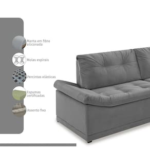 Assentos com espuma flexível de poliuretano densidade 29kg/m macia, certificada, fabricação própria, sustentados por percinta elástica. Enchimento do encosto: 100% fibra siliconadas. Estrutura de madeira maciça de pinus e eucalipto 100% reflorestada. Fixação da estrutura: grampos galvanizados anti-ferrugem. Apoiados no chão com sapatas de pvc. Revestimento/tecido: veludo 100% poliéster, com toque macio.