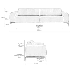 Outras Medidas:Altura do Encosto: 40 cmAltura do Assento ao Chão: 46 cmAltura do Braço: 20 cmAltura dos Pés: 18 cmLargura do Assento: 180 cmProfundidade Livre do Assento: 55 cmLargura do Braço: 25 cm