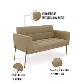 Você gosta de colecionar vários momentos memoráveis com sua família e amigos? Que tal recebê-los, com móveis de altíssima qualidade que só a D'Rossi tem? O Sofá Namoradeira Elisa é adequado para você! Seu design retrô é a grande tendência do momento. Pode ser utilizado em diversos espaços da casa, em salas, hall de entrada, quartos, cozinhas, varanda, sacada, escritório, dentre outros. Contém as seguintes características: A estrutura é feita Madeira de Eucalipto 100% de reflorestamento,Pés de Ferro Dourado que além de ser resistente e durável, suporta em média até 120 kg. Assento, encosto e braços, contém enchimento de espuma D-23 e é estofada em tecido Suede, que oferece muito conforto e resistência ao sentar, com aquela sensação de maciez e aconchego. Possui também, detalhes de costura no encosto e assento, resultando em um acabamento impecável, conferindo muito mais valor e elegância ao seu espaço. Para complementar a decoração com esse lindo Sofá Namoradeira, a dica é utilizar mantas, almofadas ou vasinho de flor. E pronto, seu cantinho estará perfeito para descansar e relaxar! Aqui, você encontra várias opções, para que seus amigos e familiares se sintam acolhidos. Garanta já seu Sofá Namoradeira.