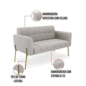 Você gosta de colecionar vários momentos memoráveis com sua família e amigos? Que tal recebê-los, com móveis de altíssima qualidade que só a D'Rossi tem? O Sofá Namoradeira Elisa é adequado para você! Seu design retrô é a grande tendência do momento. Pode ser utilizado em diversos espaços da casa, em salas, hall de entrada, quartos, cozinhas, varanda, sacada, escritório, dentre outros. Contém as seguintes características: A estrutura é feita Madeira de Eucalipto 100% de reflorestamento,Pés de Ferro Dourado que além de ser resistente e durável, suporta em média até 120 kg. Assento, encosto e braços, contém enchimento de espuma D-23 e é estofada em tecido Veludo, que oferece muito conforto e resistência ao sentar, com aquela sensação de maciez e aconchego. Possui também, detalhes de costura no encosto e assento, resultando em um acabamento impecável, conferindo muito mais valor e elegância ao seu espaço. Para complementar a decoração com esse lindo Sofá Namoradeira, a dica é utilizar mantas, almofadas ou vasinho de flor. E pronto, seu cantinho estará perfeito para descansar e relaxar! Aqui, você encontra várias opções, para que seus amigos e familiares se sintam acolhidos. Garanta já seu Sofá Namoradeira.