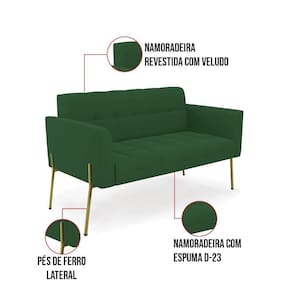 Você gosta de colecionar vários momentos memoráveis com sua família e amigos? Que tal recebê-los, com móveis de altíssima qualidade que só a D'Rossi tem? O Sofá Namoradeira Elisa é adequado para você! Seu design retrô é a grande tendência do momento. Pode ser utilizado em diversos espaços da casa, em salas, hall de entrada, quartos, cozinhas, varanda, sacada, escritório, dentre outros. Contém as seguintes características: A estrutura é feita Madeira de Eucalipto 100% de reflorestamento,Pés de Ferro Dourado que além de ser resistente e durável, suporta em média até 120 kg. Assento, encosto e braços, contém enchimento de espuma D-23 e é estofada em tecido Veludo, que oferece muito conforto e resistência ao sentar, com aquela sensação de maciez e aconchego. Possui também, detalhes de costura no encosto e assento, resultando em um acabamento impecável, conferindo muito mais valor e elegância ao seu espaço. Para complementar a decoração com esse lindo Sofá Namoradeira, a dica é utilizar mantas, almofadas ou vasinho de flor. E pronto, seu cantinho estará perfeito para descansar e relaxar! Aqui, você encontra várias opções, para que seus amigos e familiares se sintam acolhidos. Garanta já seu Sofá Namoradeira.