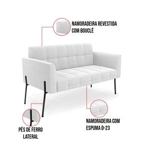 O Sofá Namoradeira 2 Lugares Elisa é uma mobília que combina elegância, conforto e durabilidade. Ele tem um design retrô e sofisticado, com Pés Laterais de Ferro Preto e revestimento em tecido Bouclê Off White, que harmonizam com qualquer ambiente. Ele é ideal para sala de estar, recepções, escritórios, cozinhas ou qualquer outro espaço que você queira decorar com estilo e bom gosto. Ele tem uma estrutura em madeira de reflorestamento eucalipto, que garante a resistência e a sustentabilidade do produto. Ele suporta até 180 kg de peso, podendo ser utilizada por pessoas de diferentes biotipos. Ele tem um acabamento reforçado e espuma de qualidade D23, que oferece maciez e aconchego. Ele contém detalhes de costura no encosto e assento, resultando em um acabamento impecável, conferindo muito mais valor e elegância ao produto. O Sofá Namoradeira Elisa é um móvel de alta qualidade, beleza e funcionalidade. Ele é fácil de transportar, pois tem um peso leve e um tamanho compacto. O Sofá Namoradeira Elisa é um produto que vai fazer a diferença na sua decoração e no seu bem-estar. Ele vai trazer charme, conforto e durabilidade para o seu ambiente. Aproveite essa oferta e leve para casa um Sofá Namoradeira de qualidade por um preço incrível. Essa é a sua chance de ter um Sofá Namoradeira maravilhoso por um preço imperdível. Corra e garanta o seu antes que acabe o estoque!